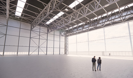 ICS is planning two aircraft hangars in close proximity to each other for maintenance and repair work. Both buildings will each have two large hangar bays with telescopic sliding doors. The roof will be stretched across the entire width of the hangar without supports. Large two-storey administrative areas with offices, training and recreation rooms are designed. Additional storage areas will be created centrally and directly adjacent to the hangar bays.