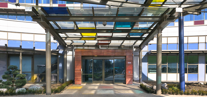 The building has a curved single-storey lobby with affiliated administrative areas, a gym and a breakfast area.