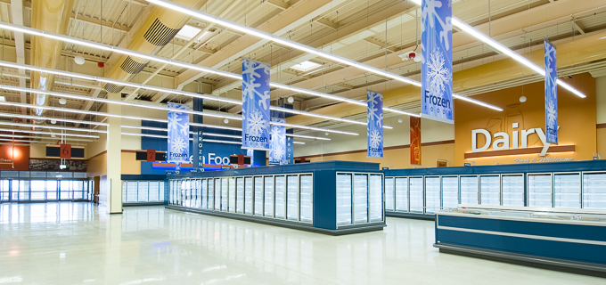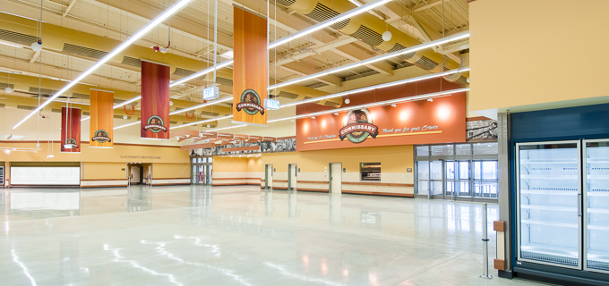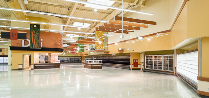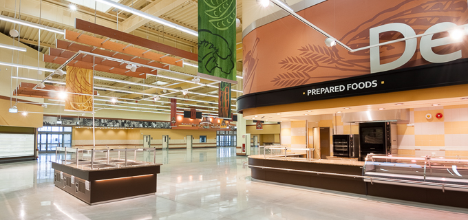 New construction of a food product market with a central sales area, containing a Deli and bakery, as well as an administration area.